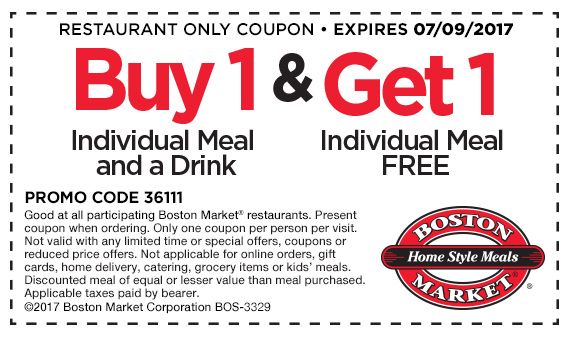 Boston Market has a printable coupon that’ll get you an individual meal when you purchase a meal and a drink.