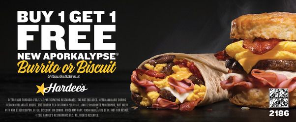 For a limited time at Hardee’s when you buy an aporkalypse biscuit or burrito get the second one for free (buy one get one). Made with sausage, ham, bacon, egg, and cheese.