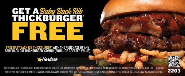 Get a free baby back rib thickburger with the purcahse of any baby back rib thickburger combo (equal or greater value). This deal expires June 30, 2017. One coupon per person, per visit.